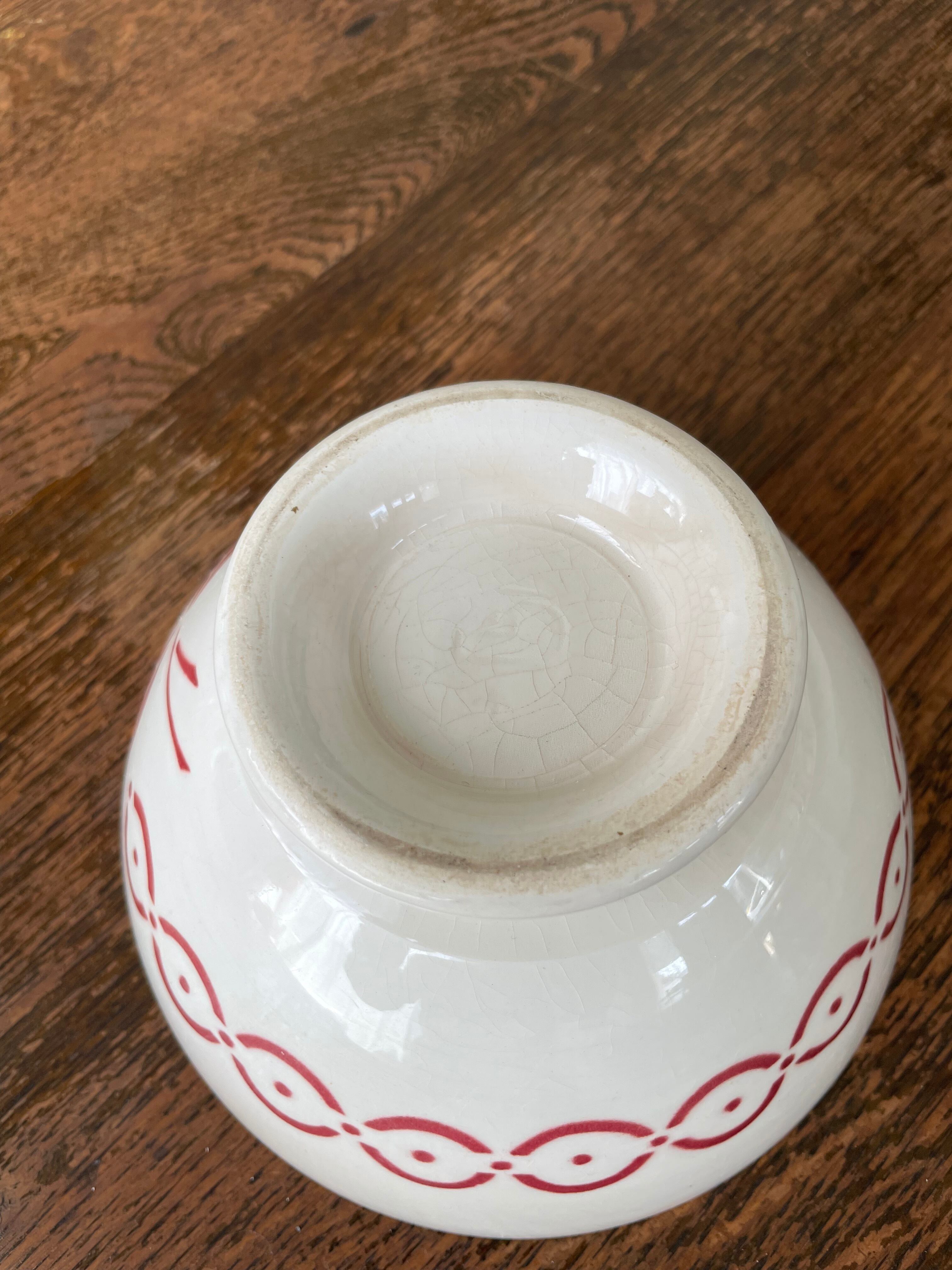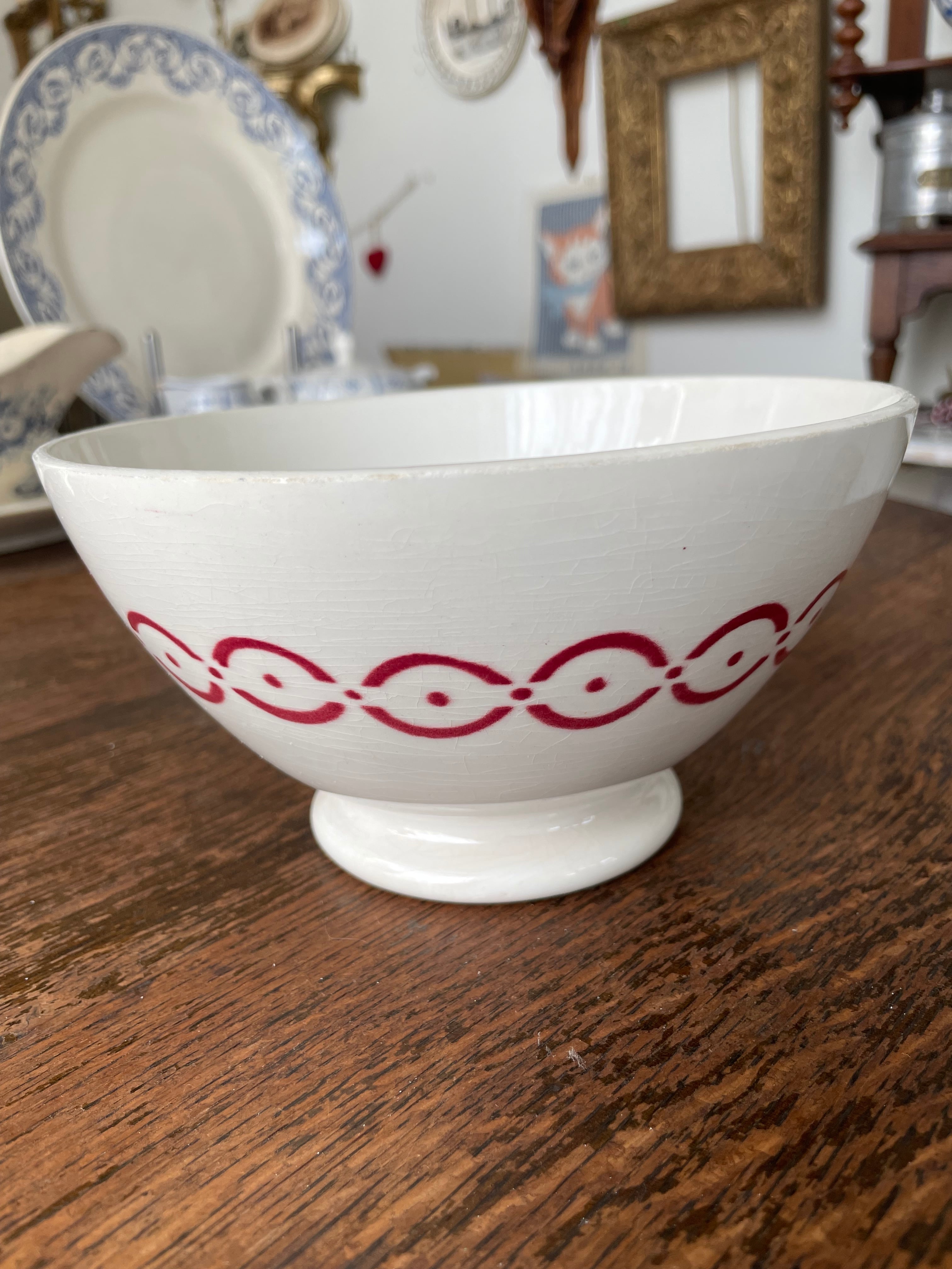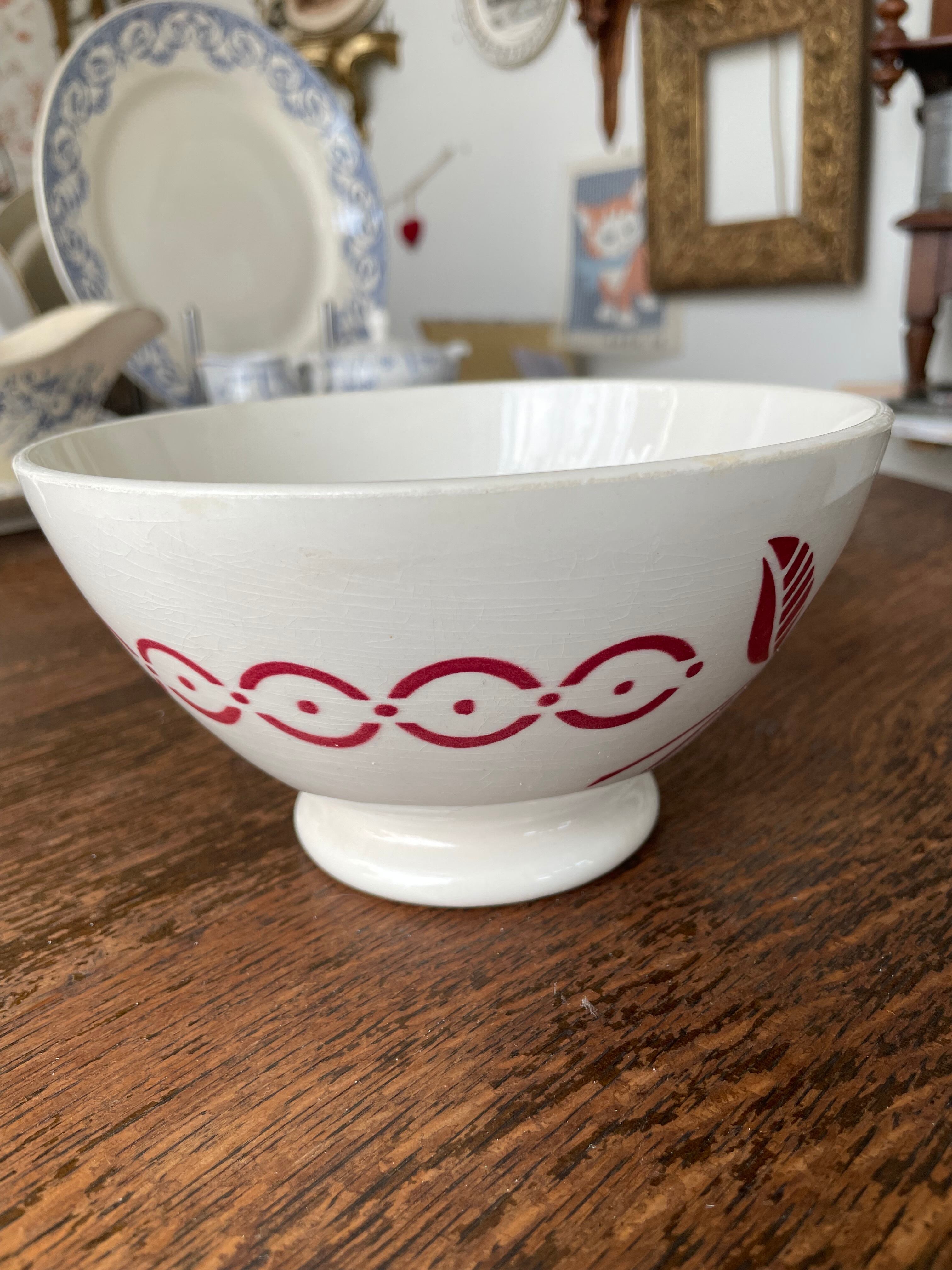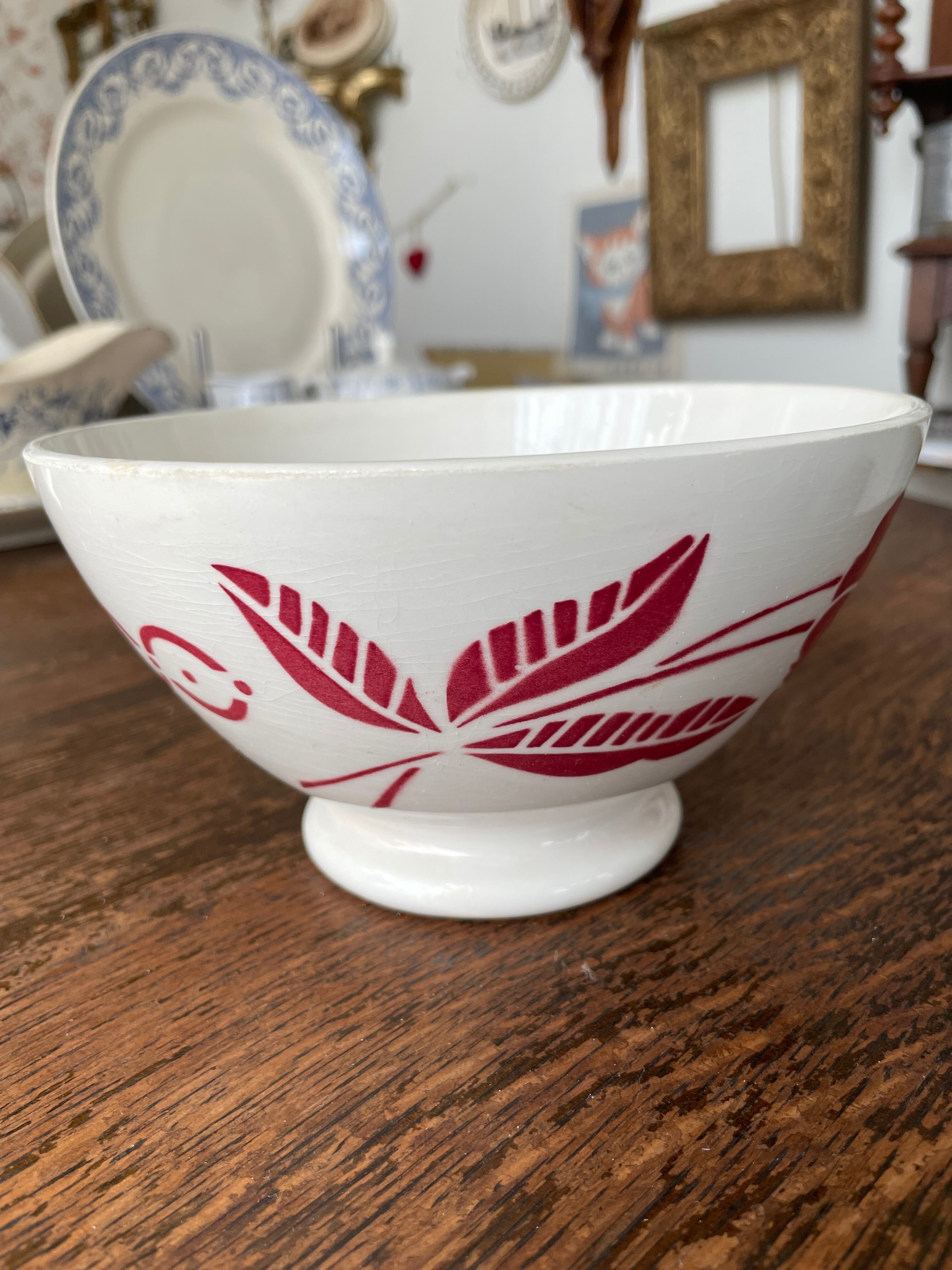 このカフェオレボウルは、フランスの伝統的な技法を用いて作られており、ステンシル技法によるデザインが印象的です。経年による色褪せや、独特の貫入模様が見られ、長い歴史を感じさせる一品。使えば使うほど表情が豊かになり、日常の食卓に特別な雰囲気を加えてくれます。