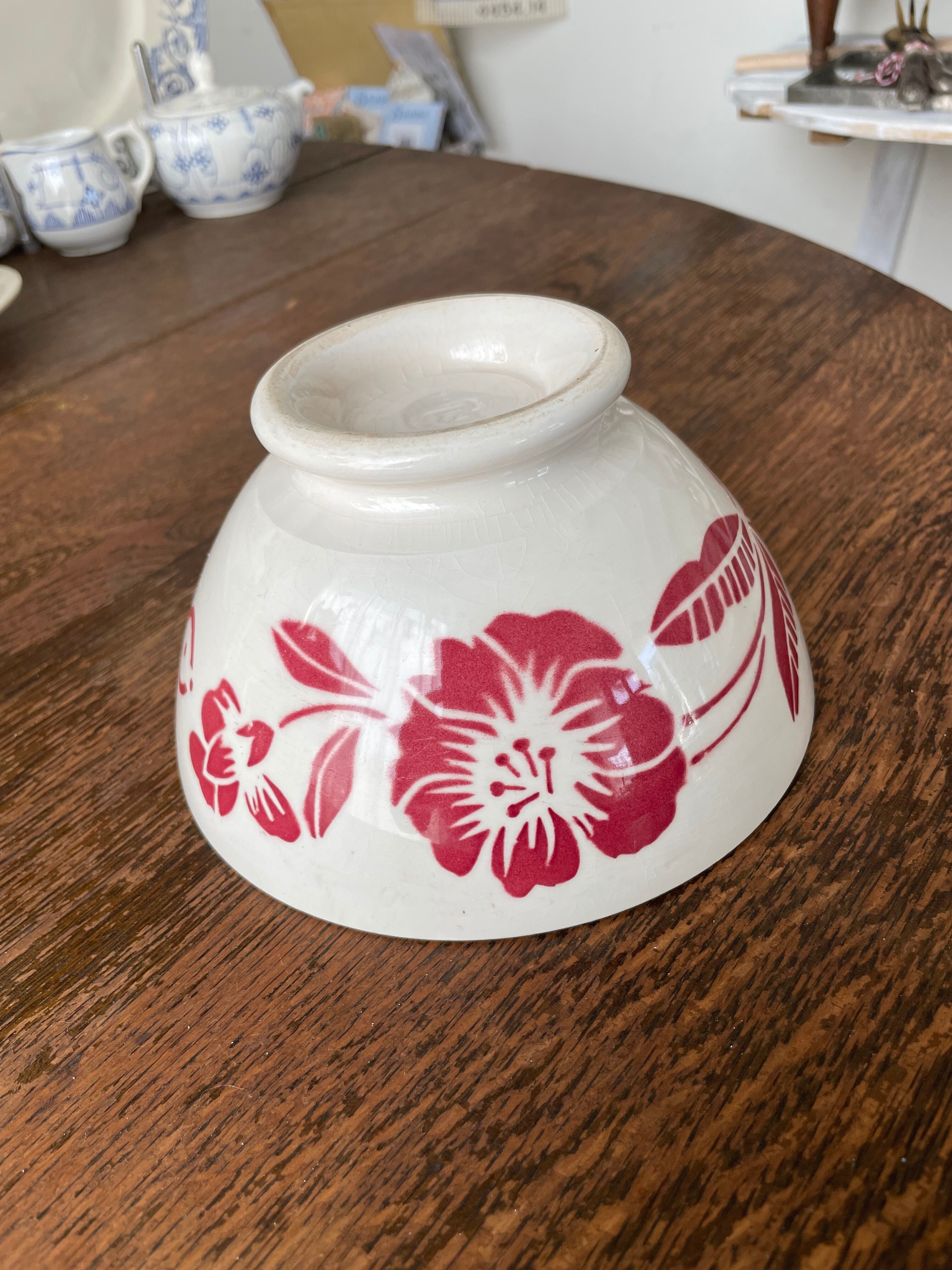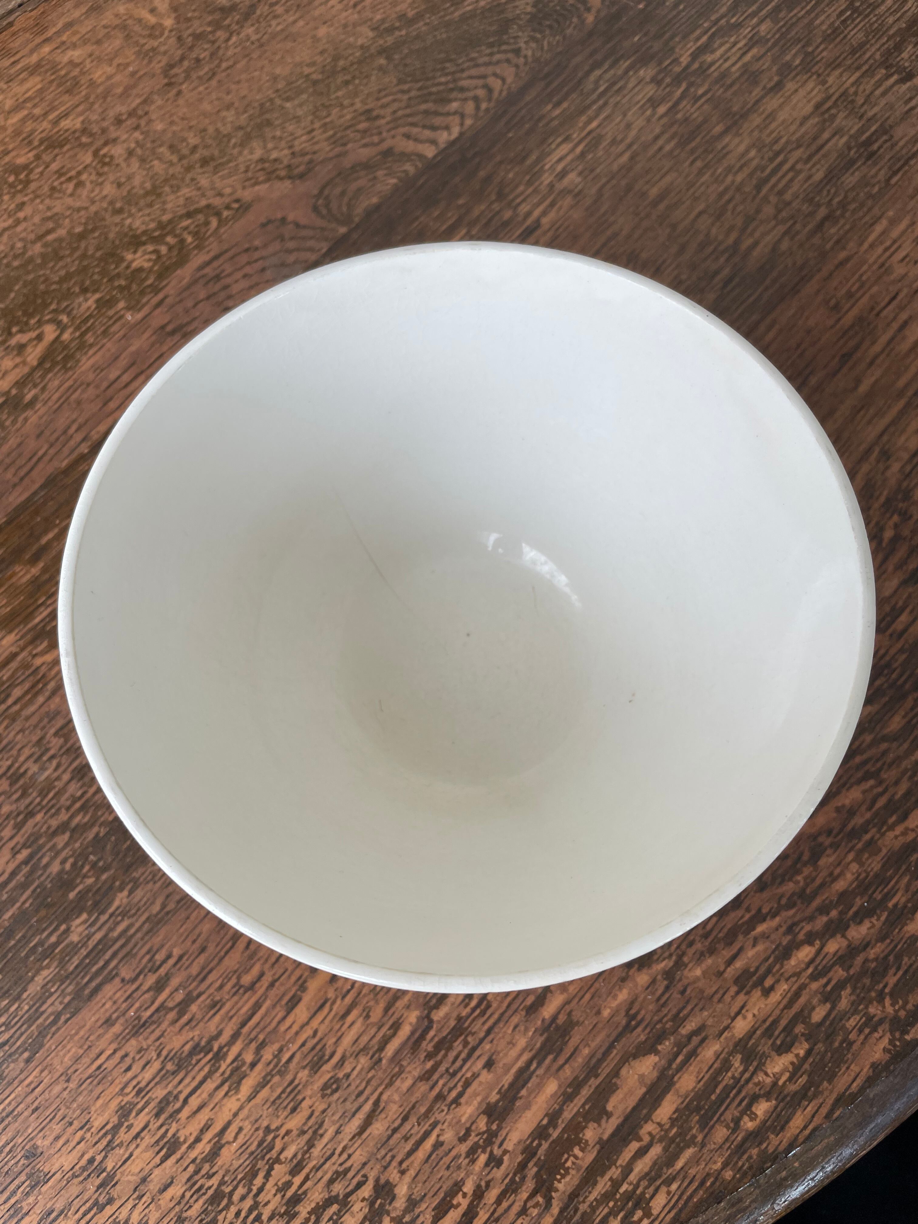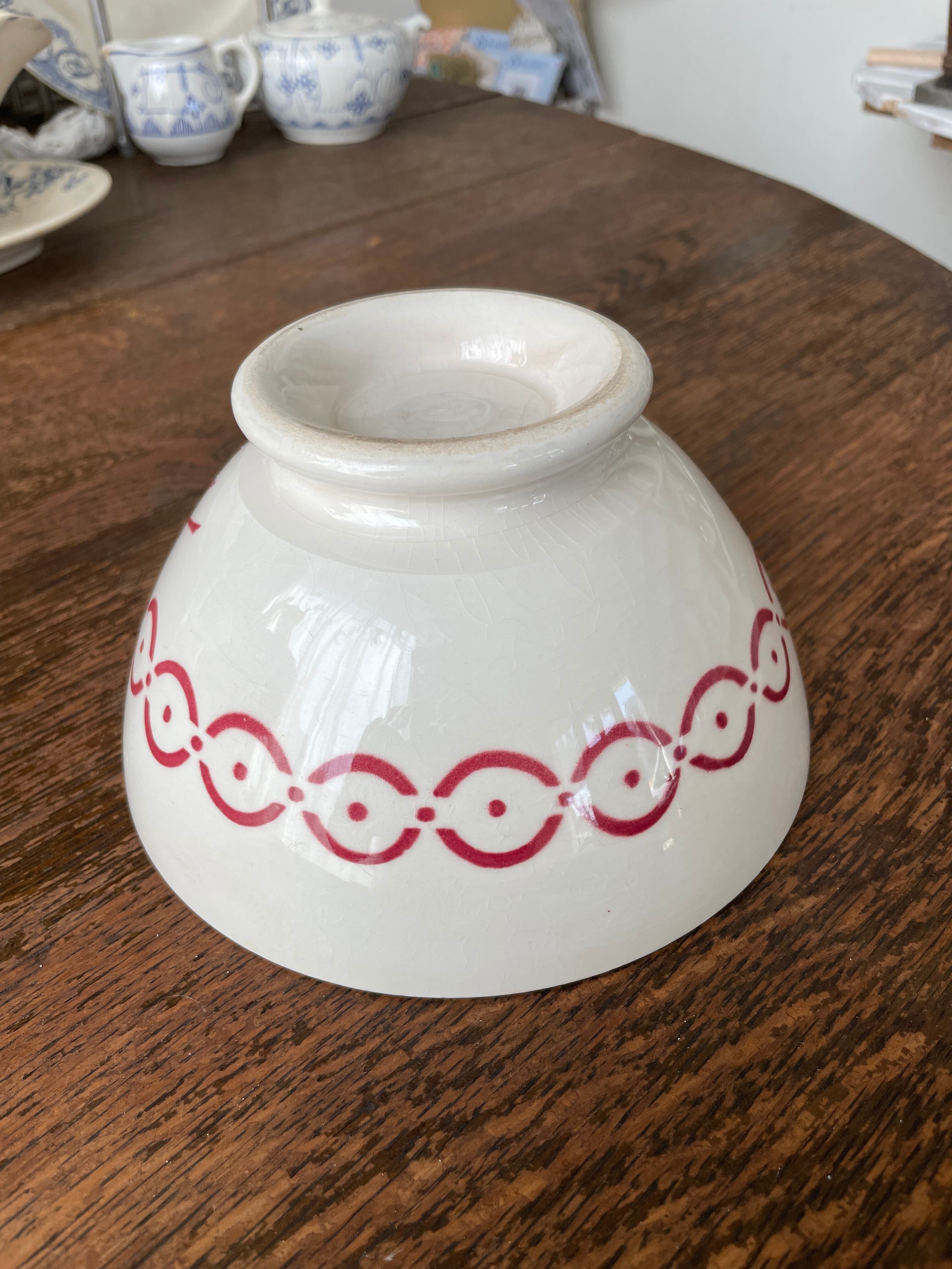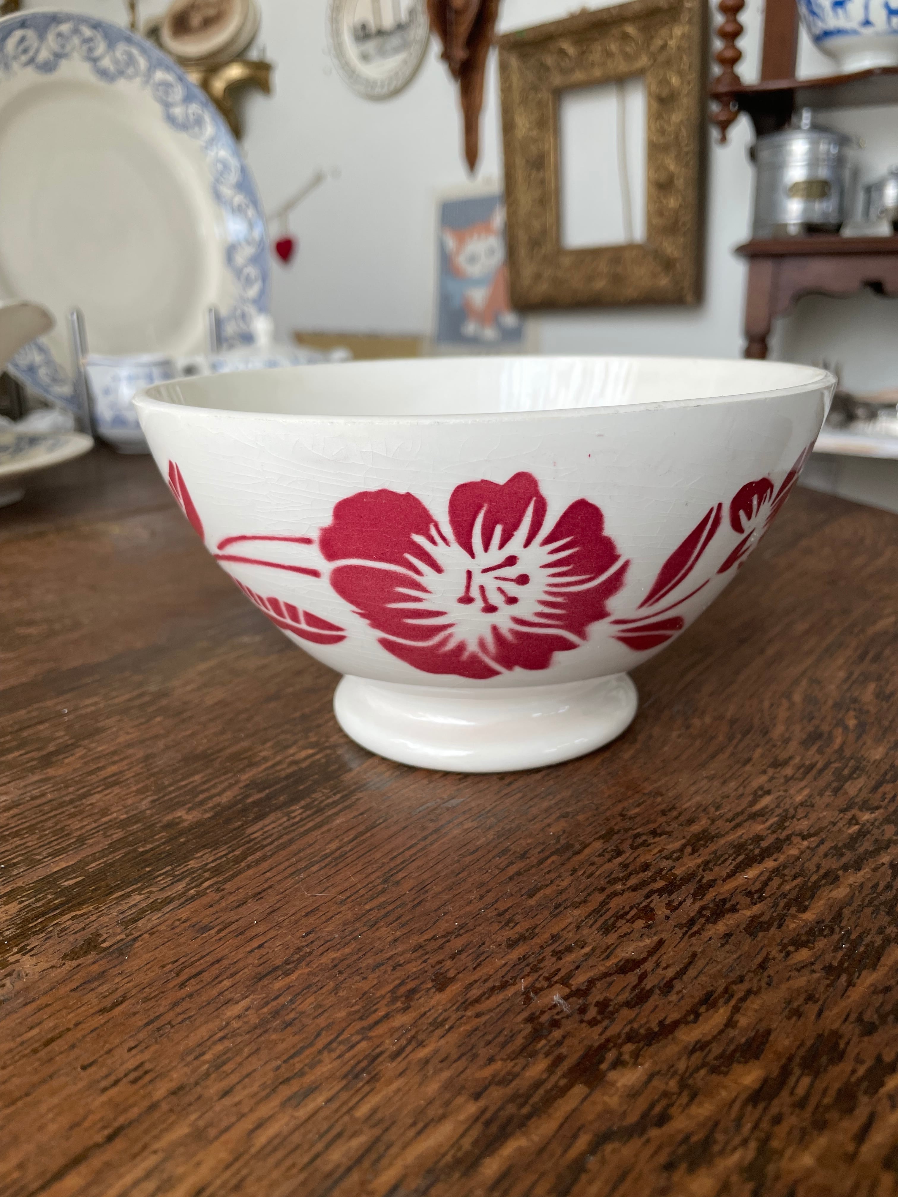 このカフェオレボウルは、フランスの伝統的な技法を用いて作られており、ステンシル技法によるデザインが印象的です。経年による色褪せや、独特の貫入模様が見られ、長い歴史を感じさせる一品。使えば使うほど表情が豊かになり、日常の食卓に特別な雰囲気を加えてくれます。