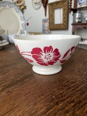 クラシックな魅力を持つヴィンテージ ステンシルのカフェオレボウルをご紹介いたします。 直径は約16.5cm、高さは8.8cmで、カフェオレだけでなく、デザートやスープ、サラダボウルとしてもご利用いただける多用途なサイズ感が魅力です。